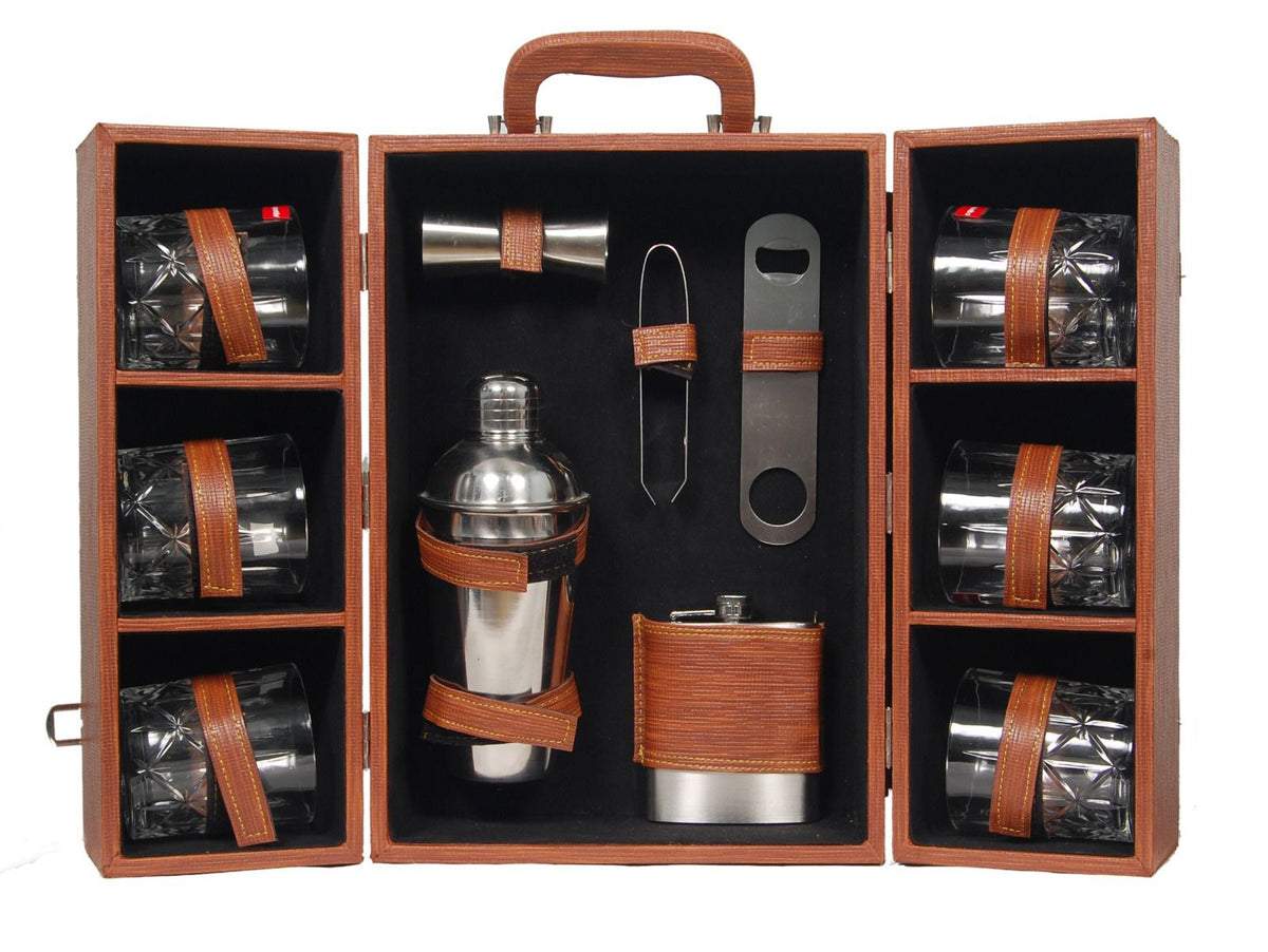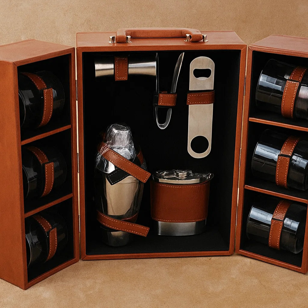 Double Door Bar Set – A stylish, portable bar kit packed in a premium travel box. Includes 6 sleek glasses, one cocktail shaker, hip flask, jigger, tong, and bottle opener. Perfect for home bars, travel, or gifting. Organize, serve, and impress – all from this compact, all-in-one bar solution.