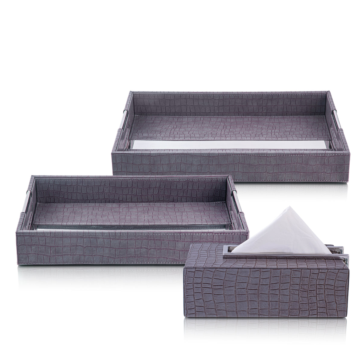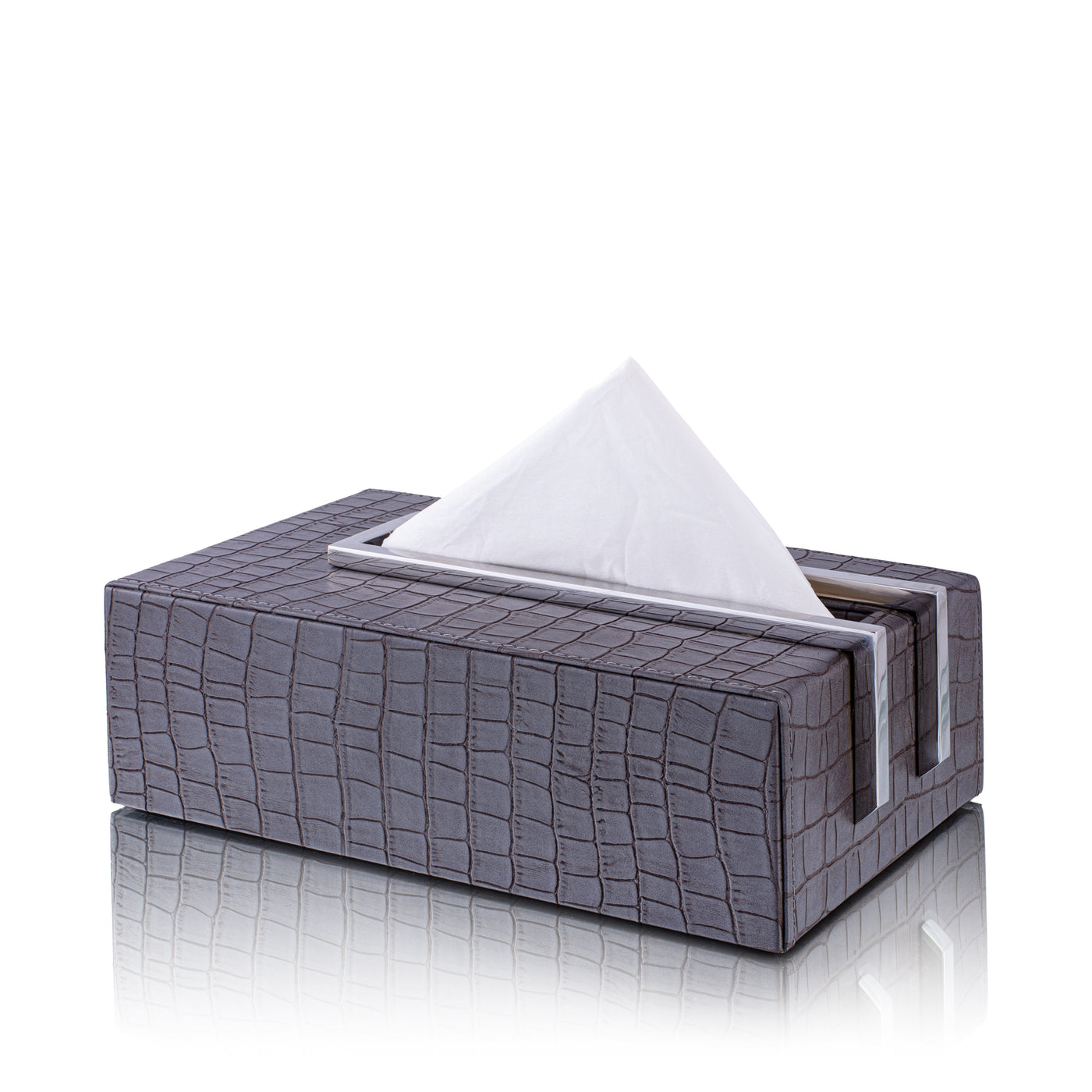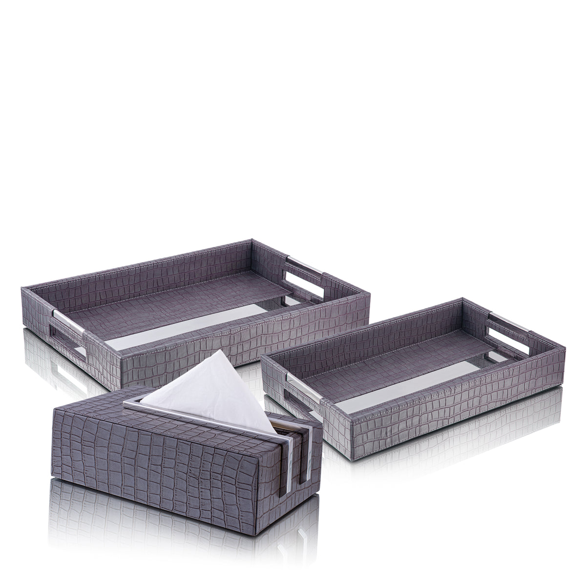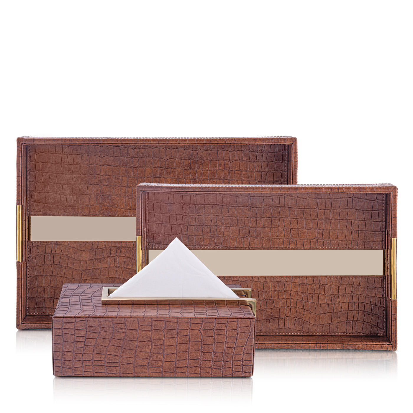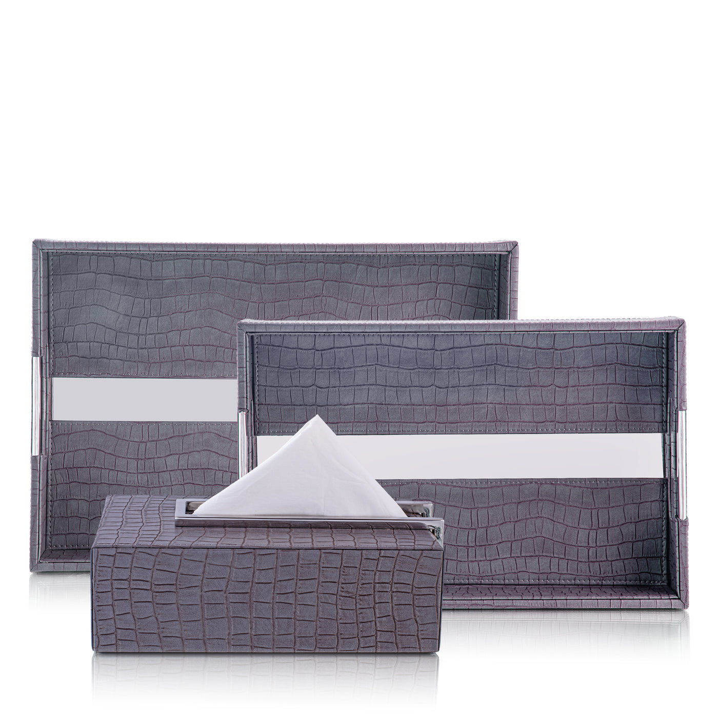 Leather Tray & Tissue HolderCrafted from premium faux leather, this elegant set includes a tray and matching tissue holder. Perfect for desks, consoles, or coffee tables...