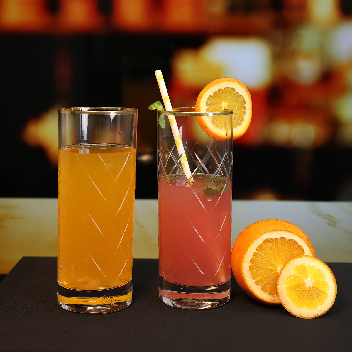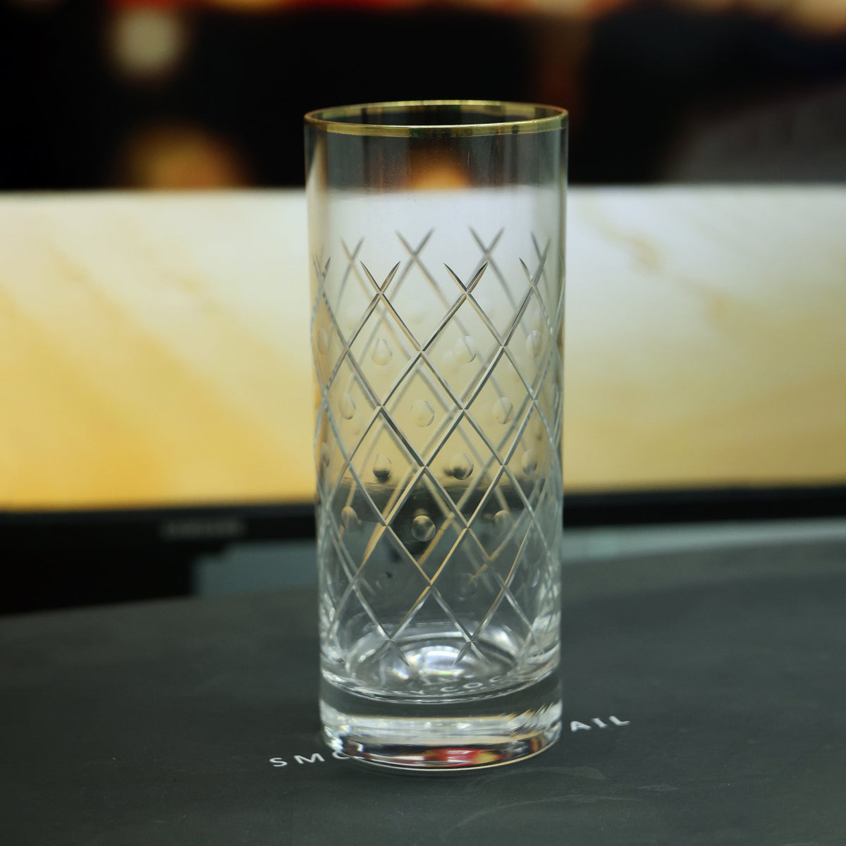 The Tall Crystal Glass features exquisite craftsmanship, a sleek design, and a luxurious gold rim, perfect for elegant dining experiences.